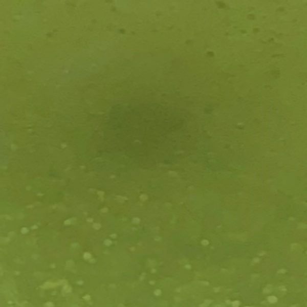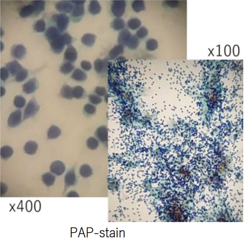 緑変した背景に大小不同の薄く白い類円形を示す泡沫細胞が散見される