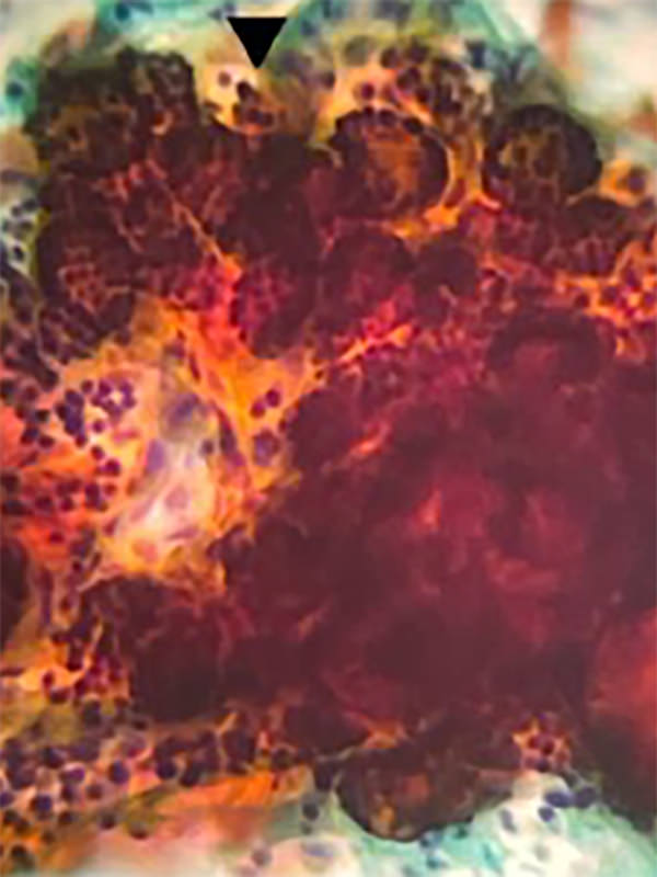 リンパ球が靄のように観察され、視野中にはわずかな濾胞上皮▲が観察される。どこにも焦点が合わないことが特徴的である。