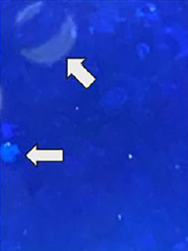 淡青~白色 辺縁不規則な大小の集塊にて多数散見された症例